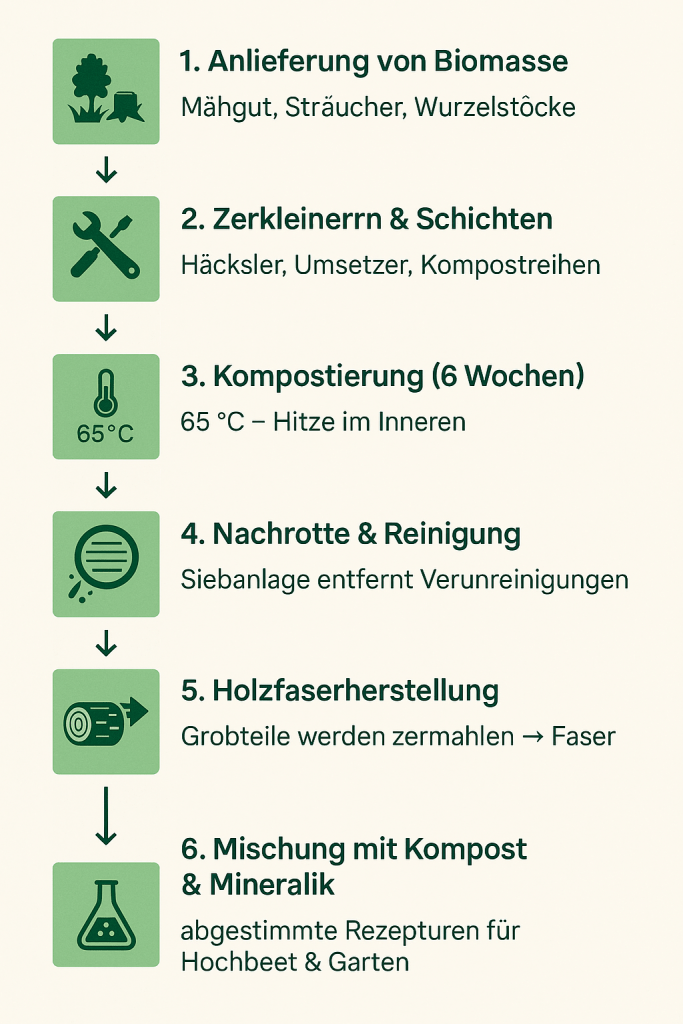 Sobald der Kompost noch weiter verrottet ist, wird er von Verunreinigungen befreit. Danach gelangt die Erde über Förderbänder zum sogenannten „Ufo“, einem runden Sieb, das grobe Teile aussortiert. Diese werden zermahlen, wodurch feine Holzfaser entsteht. Sie ersetzt Torf und eignet sich ebenso als Einstreu im Stall. Erste Versuche mit der selbst hergestellten Holzfaser fanden bereits 2021 statt, heute sind die Rezepturen weitestgehend ausgereift.