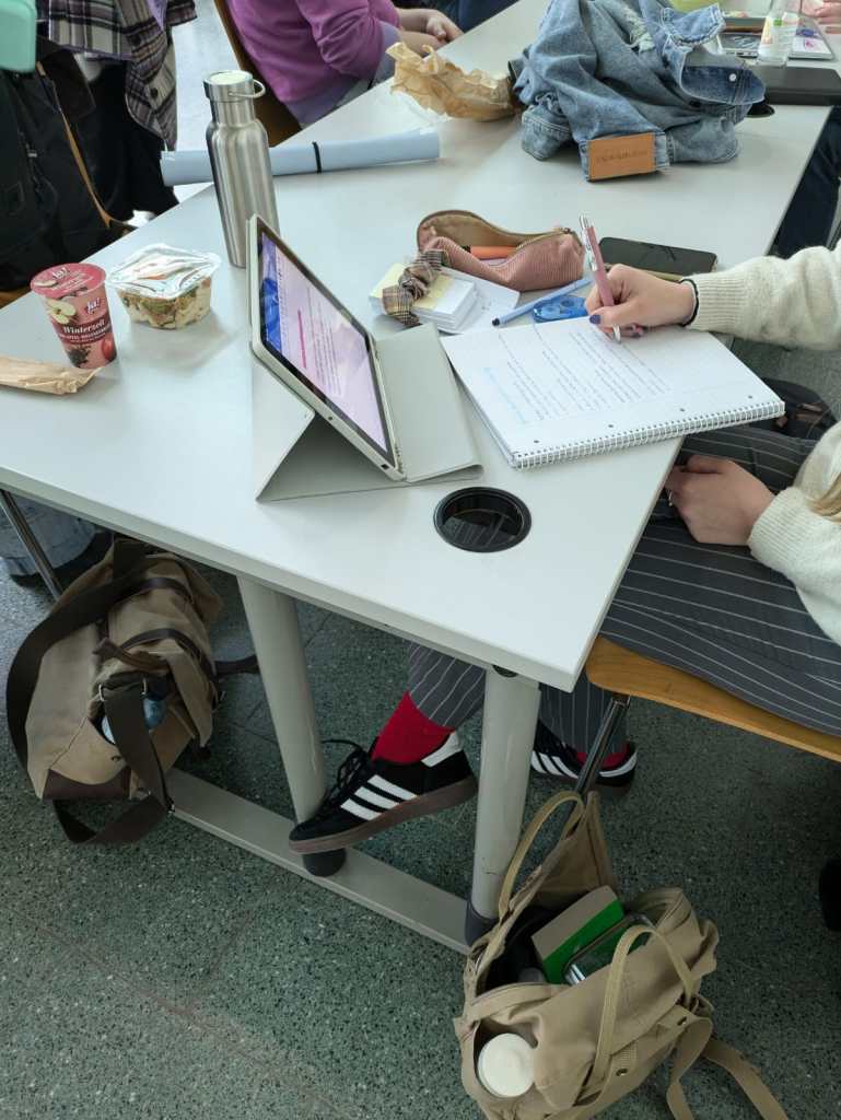 Am Tisch liegen Schokoriegel und Jeansjacke, Jausensackerl und abgepackter Nudelsalat, daneben Schüttelpennal, Handy, Bleistift, Schreibblock. Die jungen Leute essen von Servietten, trinken aus Glas- oder Edelstahlflaschen, der Haargummi ummantelt einen Stoß Karteikarten.